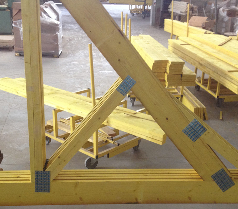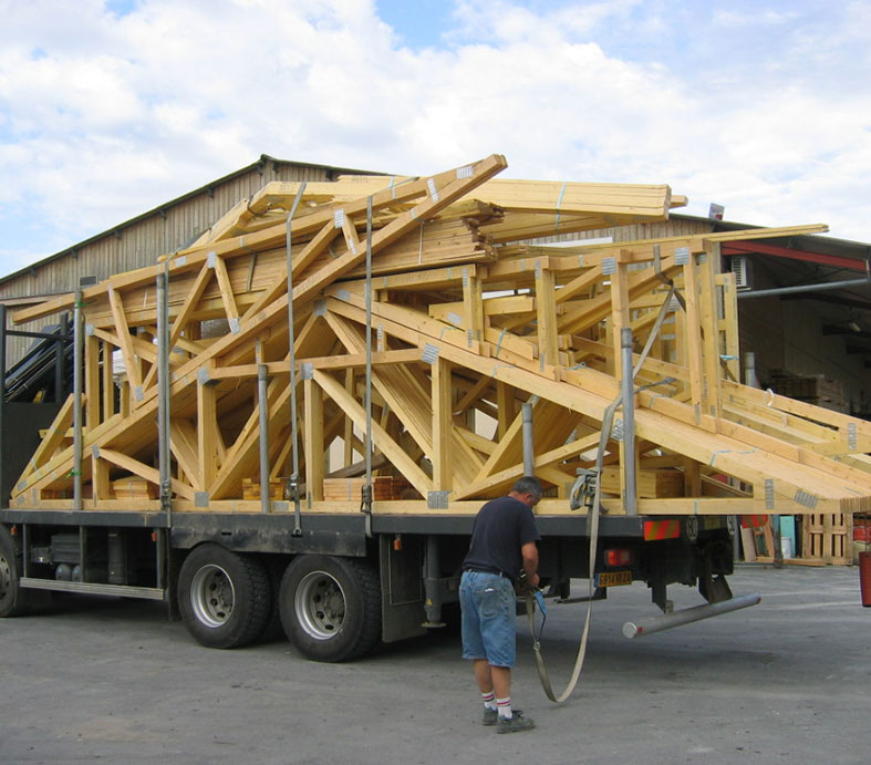 Toutes les pièces des charpentes industrielles sont débitées sur le centre d'usinage "Hundegger Speed Cut". Chaque pièce porte un numéro qui permet le repérage sur les plans d'assemblage. En sortie de machine, les pièces sont regroupées par type de ferme et le montage s'effectue dans l'ordre de pose.